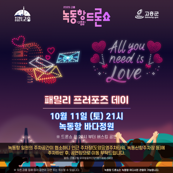 ‘2025 고흥 녹동항 드론쇼’는 4월부터 10월까지 매주 토요일 저녁에 녹동바다정원을 빛으로 물들게 합니다.