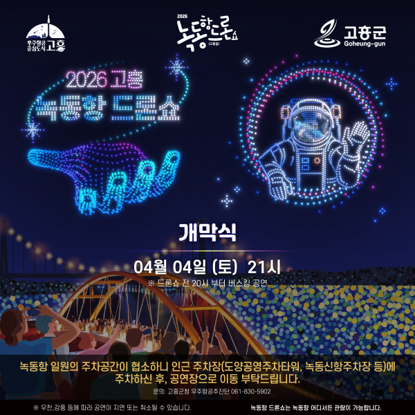 ‘2026 고흥 녹동항 드론쇼’는 4월부터 10월까지 매주 토요일 저녁에 녹동바다정원을 빛으로 물들게 합니다.